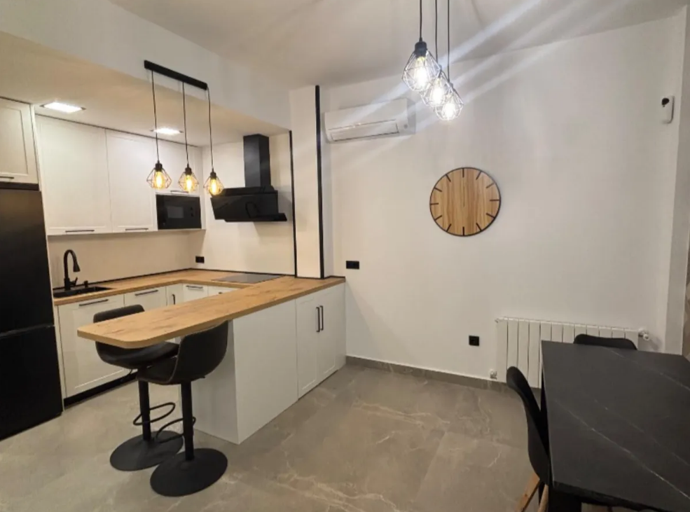 Características principales: Distribución: 2 dormitorios amplios con 11 mts cada uno, luminosos y equipados. 2 baños completos con platos de ducha modernos, griferia en negro mate y acabados elegantes. Salón acogedor con iluminación LED de diseño y una bonita decoración.